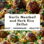 Garlic Meatball and Herb Rice Skillet is a hearty, one-pan meal with juicy garlic-infused meatballs simmered in a bed of fragrant herbed rice. Full of flavor and comfort, it’s a quick and wholesome dinner that comes together in under 45 minutes with minimal cleanup.