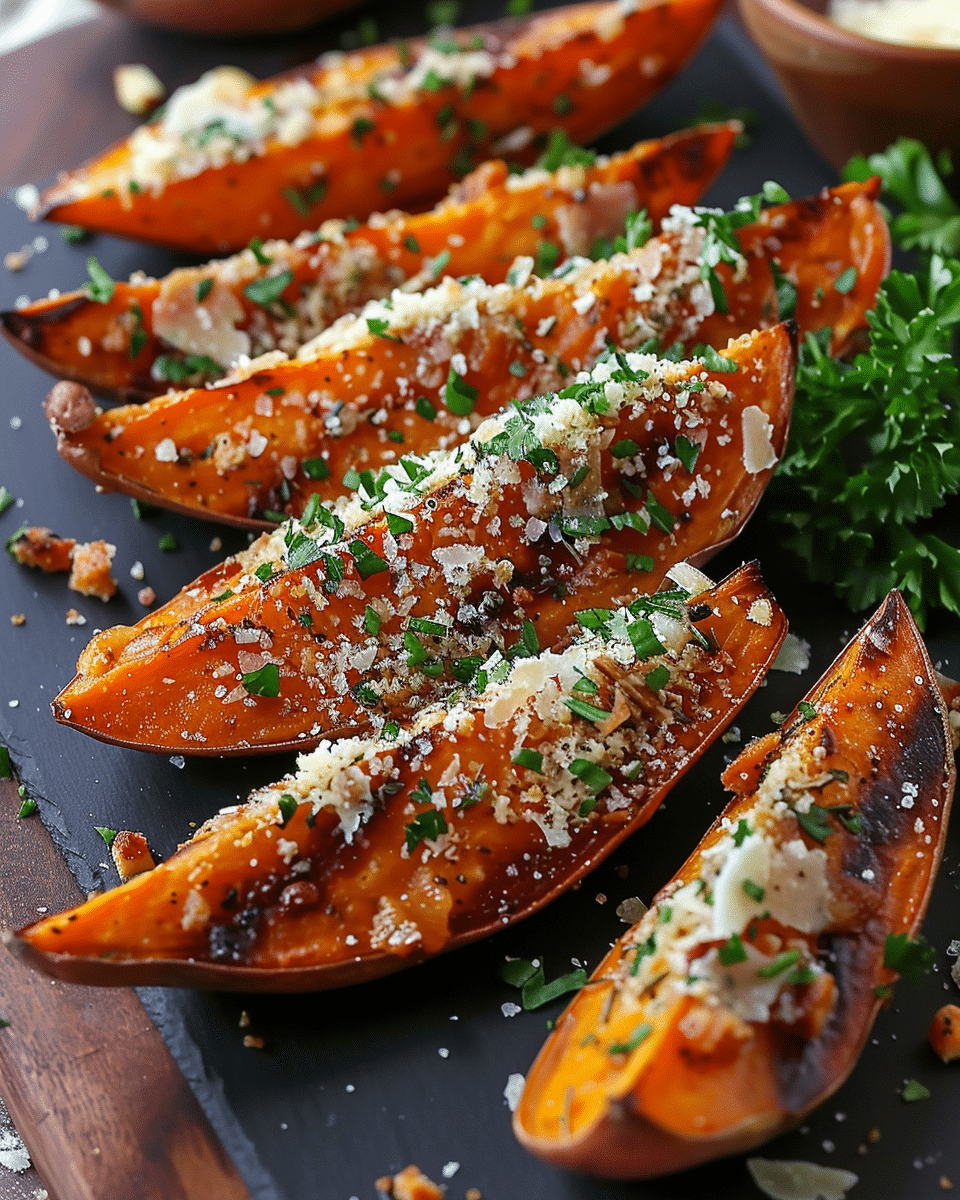 PrintGarlic Parmesan Sweet Potato Wedges