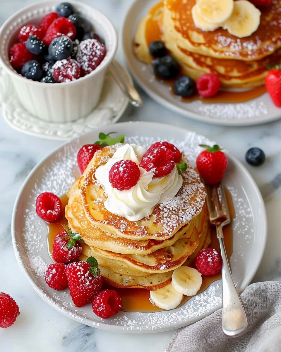I serve the pancakes warm with maple syrup, fruit, or my favorite toppings.
