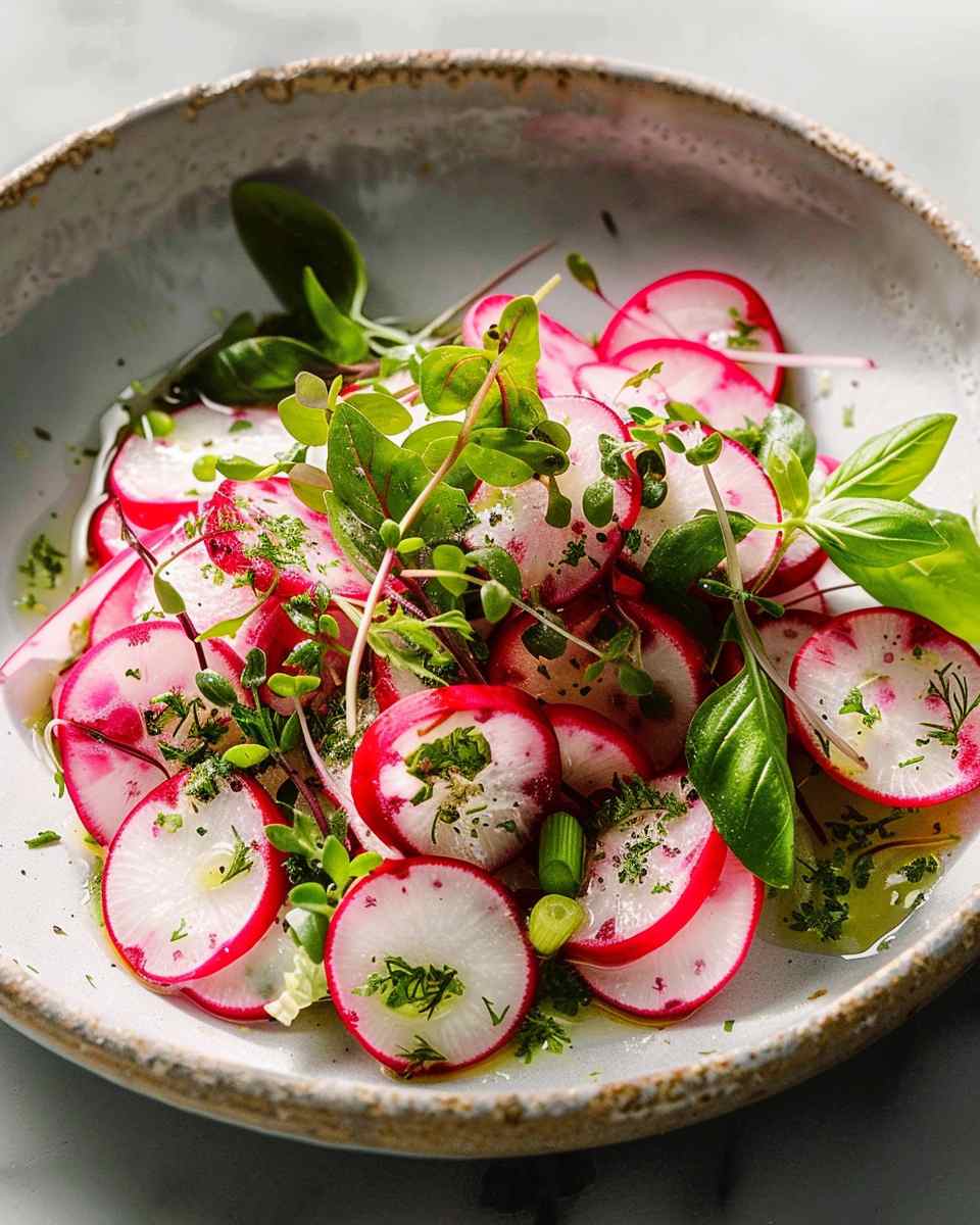 A crisp and refreshing radish salad inspired by Gordon Ramsay, featuring thinly sliced radishes tossed in a bright lemon-Dijon dressing with fresh herbs for a light yet flavorful dish.