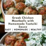 Greek Chicken Meatballs with Homemade Tzatziki Sauce are a flavorful, protein-packed dish made with herby chicken meatballs and a cool, creamy Greek yogurt-based dip.