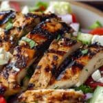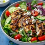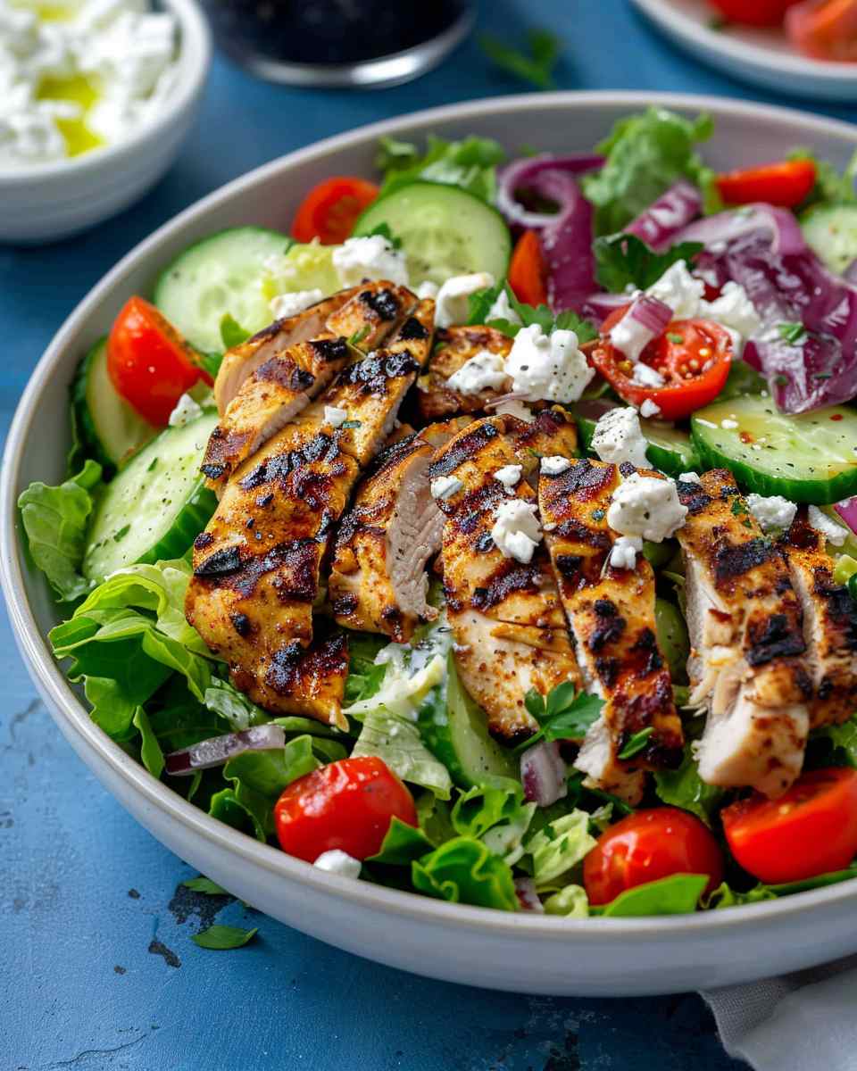 A fresh and hearty Greek grilled chicken salad packed with juicy marinated chicken, crisp vegetables, and tangy Mediterranean flavors.
