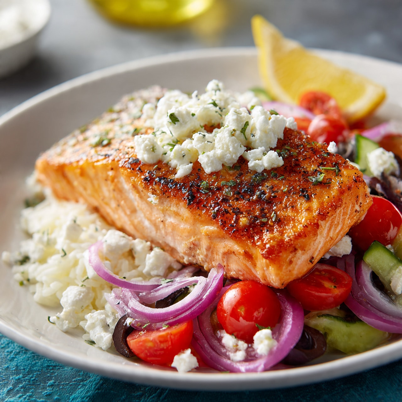 Tender baked salmon infused with lemon, garlic, and Mediterranean herbs, topped with tomatoes, olives, and feta for a fresh and vibrant meal.