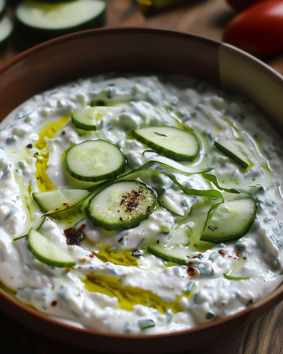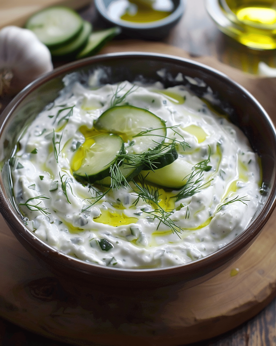 A creamy, refreshing Greek yoghurt dip made with cucumber, garlic, lemon, and olive oil—perfect as a dip, spread, or sauce for Mediterranean meals.