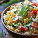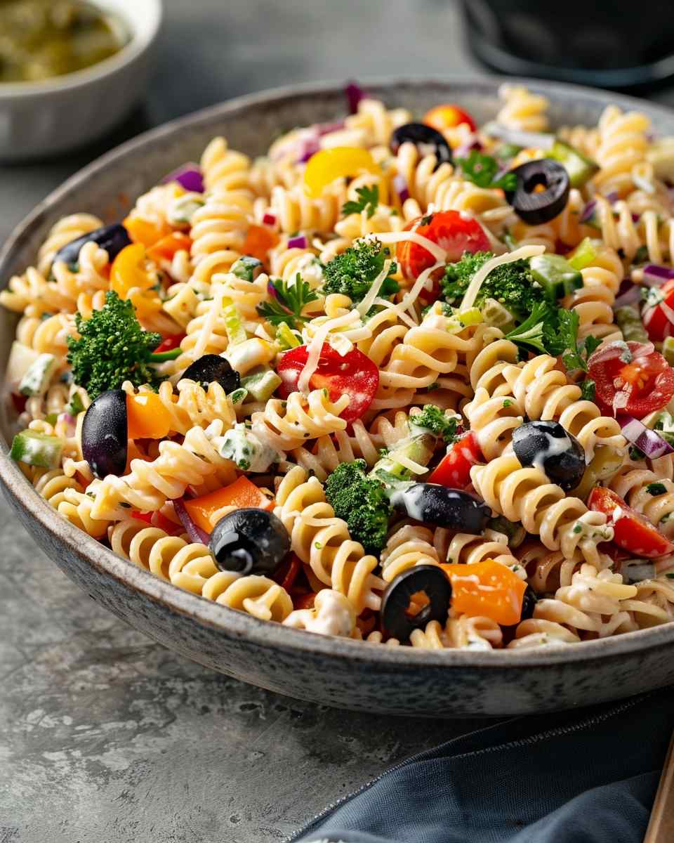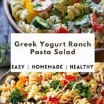 A creamy yet refreshing pasta salad made with Greek yogurt ranch dressing, tender pasta, crisp vegetables, and fresh herbs for a lighter twist on a classic dish.