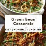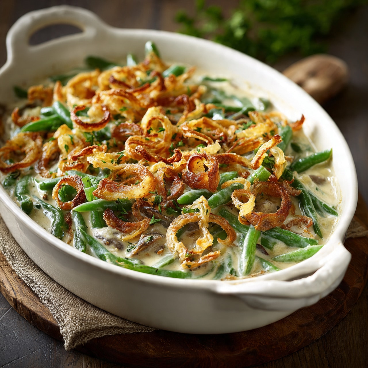 A classic and comforting green bean casserole made with tender green beans baked in a creamy mushroom sauce and topped with crispy fried onions for a delicious crunchy finish.