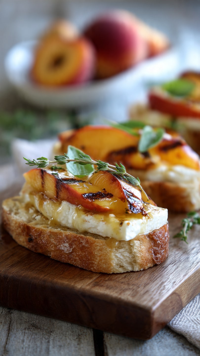 - Top each crostini with a grilled peach slice and drizzle with honey or balsamic glaze.
