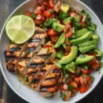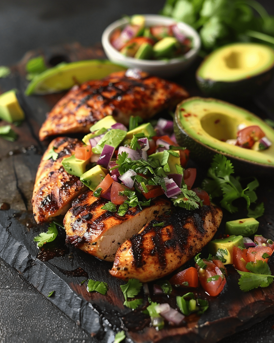 Grilled Chicken with Avocado Salsa is a quick, healthy, and flavorful meal perfect for summer dinners or light lunches. Juicy grilled chicken is seasoned with zesty spices and topped with a refreshing avocado salsa made with lime, cherry tomatoes, and cilantro.