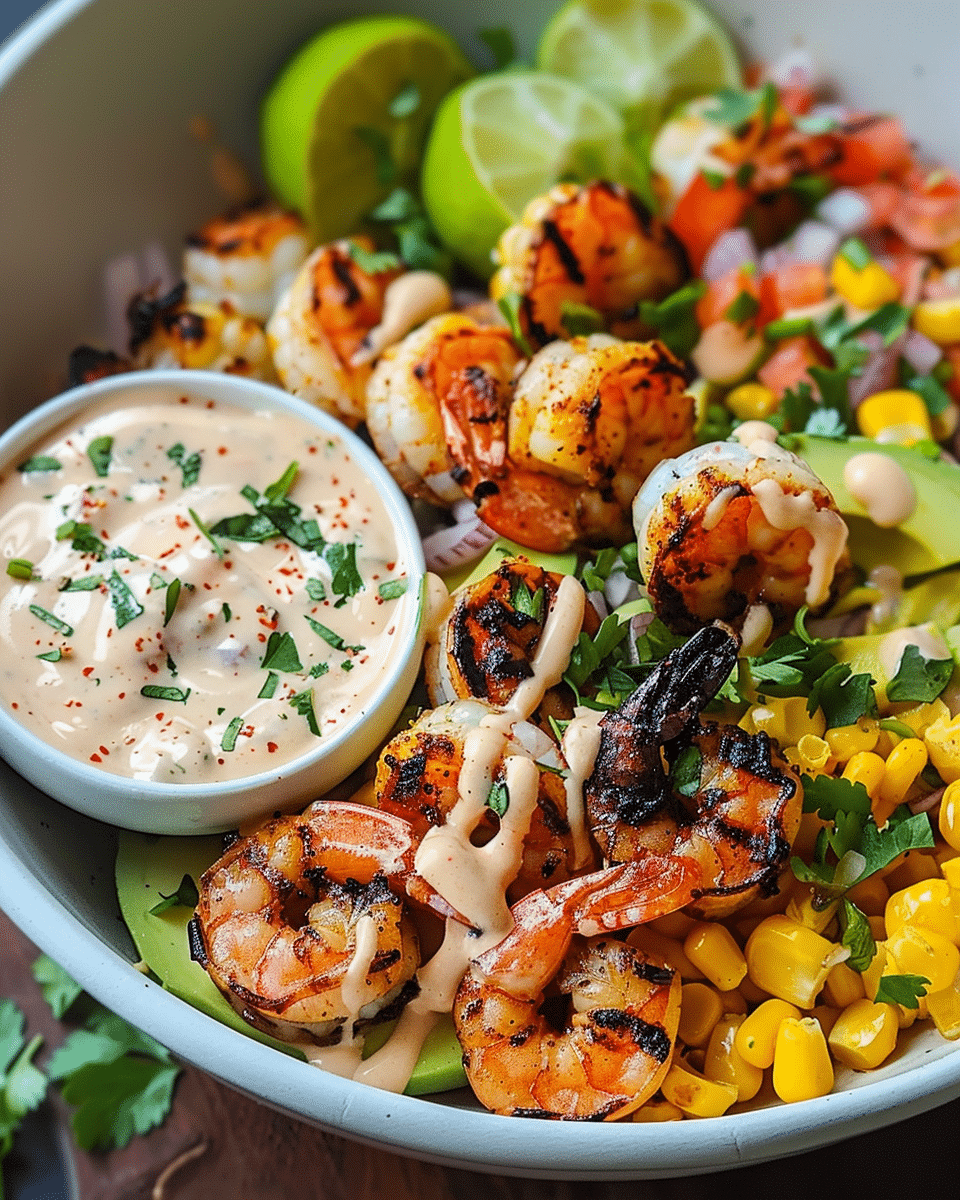 Assemble the bowls: Layer rice, quinoa, or greens as a base. Top with grilled shrimp, a generous scoop of corn salsa, and drizzle with creamy sauce. Garnish with avocado, cilantro, or lime wedges.