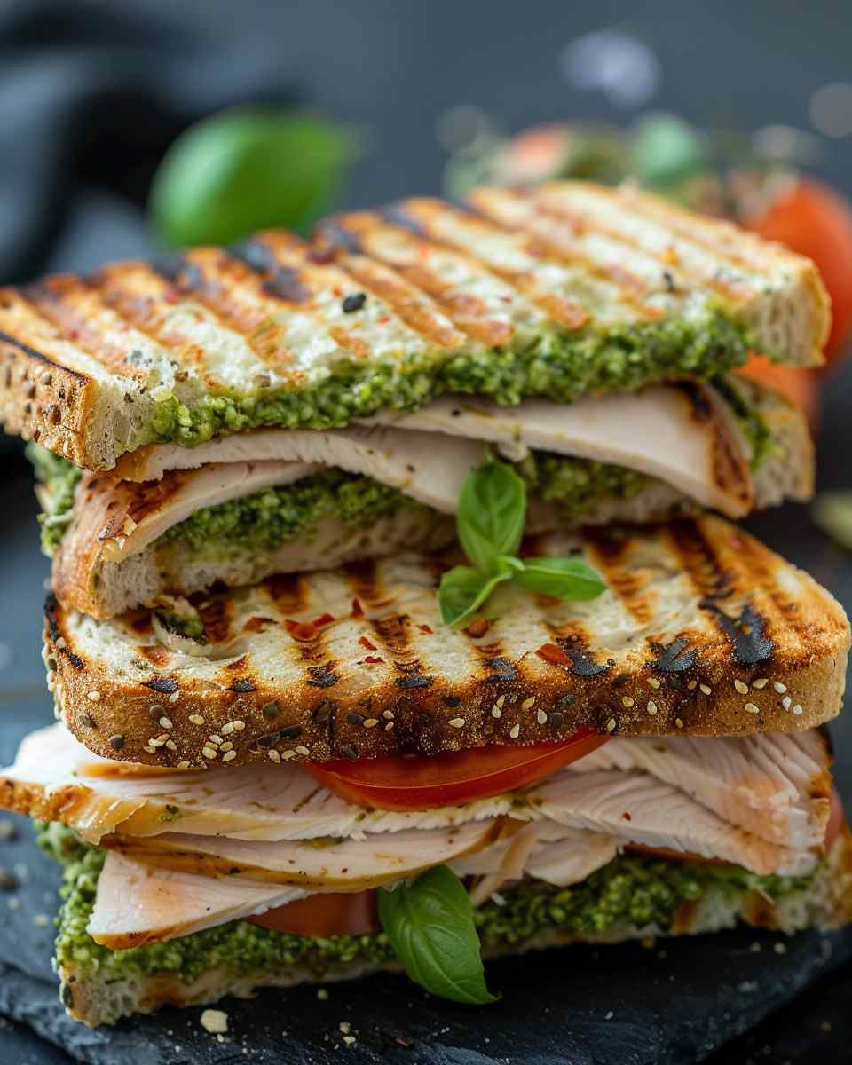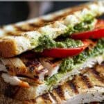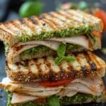 A warm and crispy grilled turkey pesto sandwich filled with savory turkey, fragrant pesto, and melted cheese. This quick and flavorful sandwich is perfect for an easy and satisfying meal.