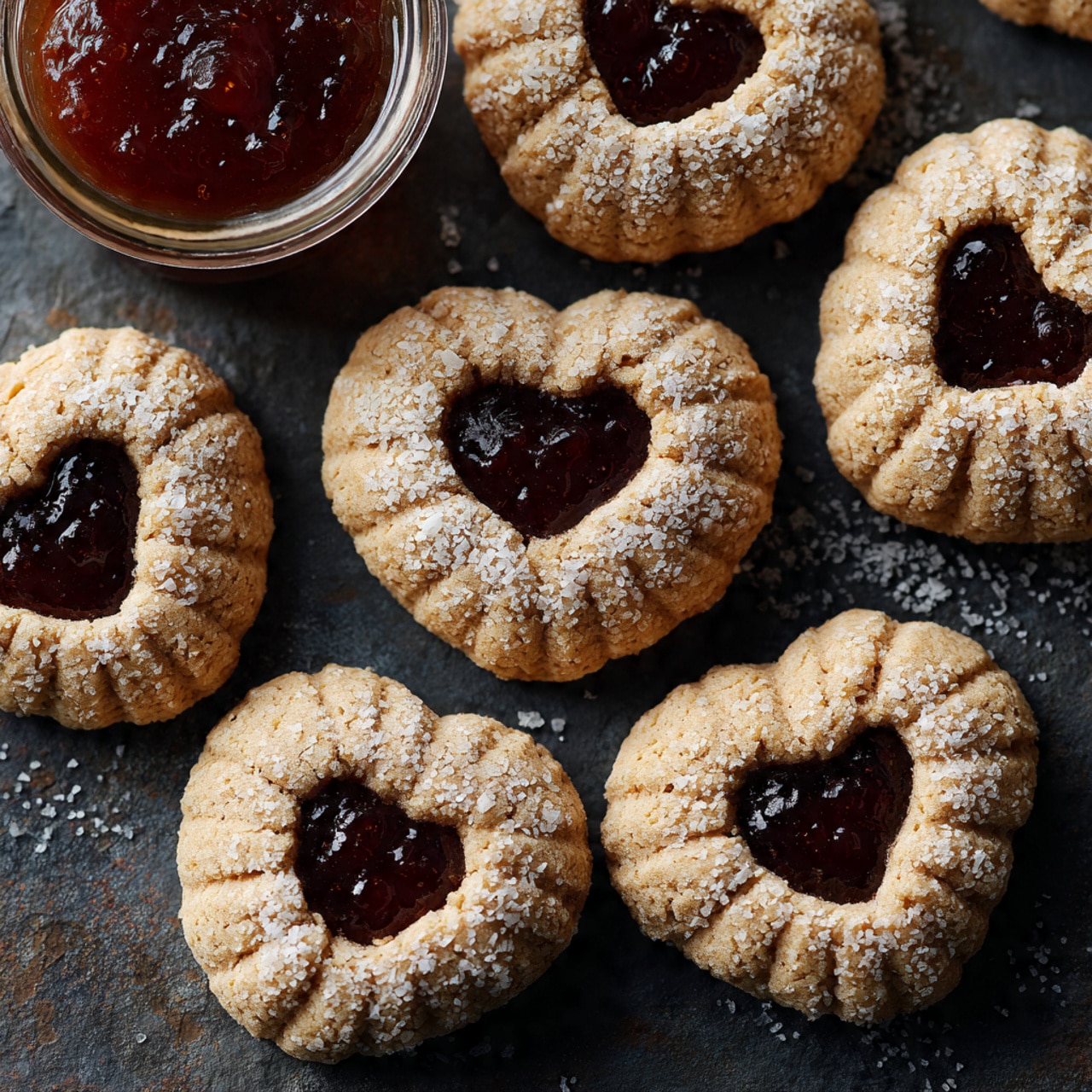 Buttery, tender cookies shaped into delicate hearts and filled with sweet fruity jam, making them a charming and delicious treat for special occasions.