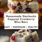 Homemade Starbucks Copycat Cranberry Bliss Bars are chewy blondie-style bars topped with tangy cream cheese frosting, sweet dried cranberries, and a white chocolate drizzle. These bakery-style treats are festive, rich, and easy to make at home.