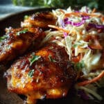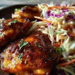 Tender bone-in chicken thighs glazed with a sweet and savory honey apple sauce, served alongside a crisp and refreshing autumn slaw for a perfectly balanced meal.
