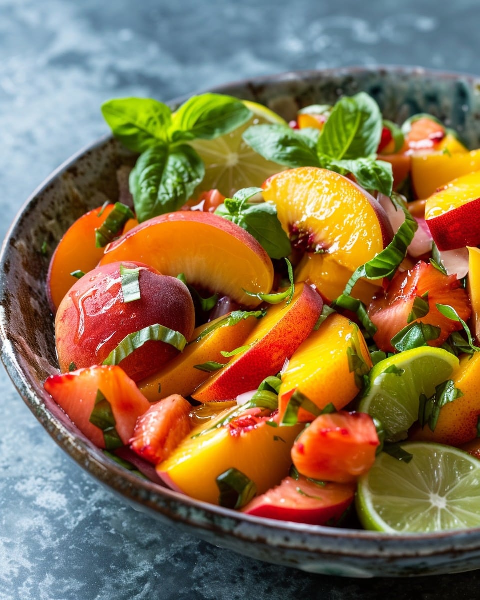 Honey Lime Basil Peach Fruit Salad is a fresh, juicy, and vibrant summer salad made with ripe peaches, berries, a tangy honey‑lime dressing, and fragrant basil. It’s light, colorful, and perfect for brunch, dessert, or a healthy snack.