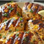 Juicy baked chicken breasts coated in a sweet and spicy hot honey glaze that caramelizes beautifully in the oven for bold, comforting flavor.