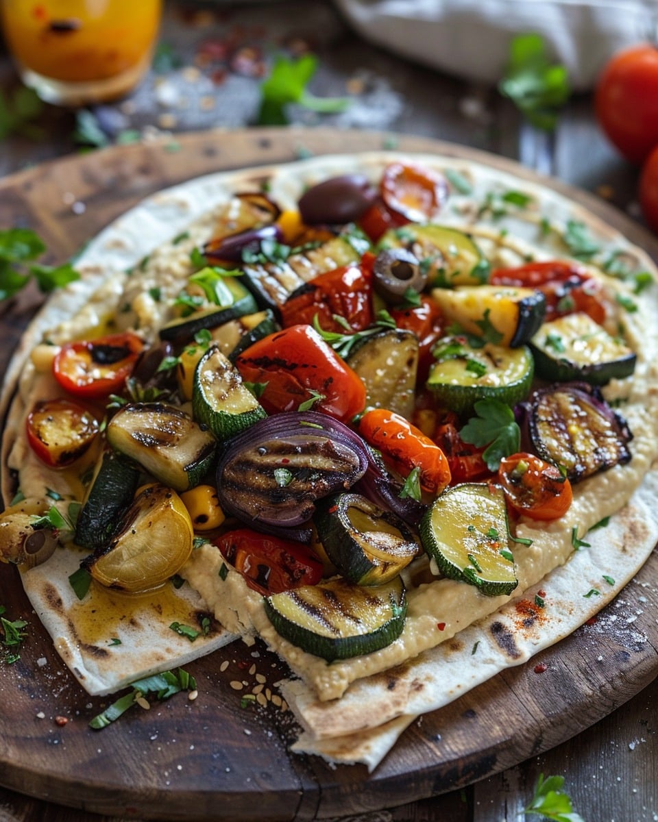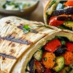 A fresh, colorful wrap filled with smoky grilled vegetables and creamy hummus, offering a light yet filling meal that’s wholesome, flavorful, and satisfying.