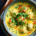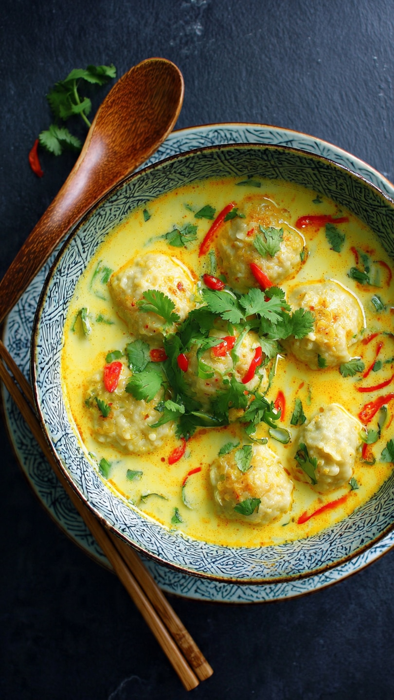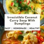 I love this recipe because it brings together the heartiness of a dumpling soup with the exotic flavors of a Thai-style coconut curry. The broth is rich and fragrant with garlic, ginger, and curry paste, while the dumplings are soft, pillowy, and perfect for soaking up all that flavor. It’s easy to adapt, naturally dairy-free, and comes together in under an hour, making it perfect for weeknights or weekends alike.