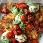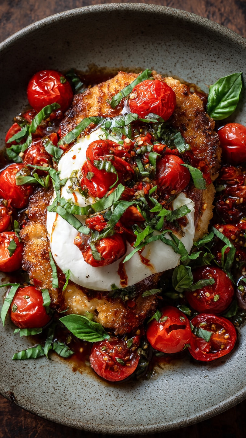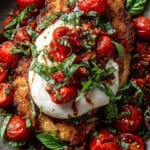 Italian Basil Chicken Cutlets with Tomato and Burrata Topping is a fresh and elegant dish featuring crispy breaded chicken cutlets topped with juicy marinated tomatoes, creamy burrata, and fragrant basil. It’s a vibrant, flavorful meal perfect for weeknights or entertaining.