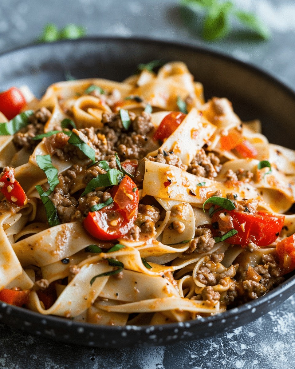 These Italian Drunken Noodles are a hearty, one-skillet pasta dish featuring ground Italian sausage, sautéed bell peppers, wide egg noodles, and a garlicky tomato and white wine sauce. Bold, comforting, and bursting with rustic Italian flavor, it’s the perfect quick weeknight meal or crowd-pleasing pasta dinner.
