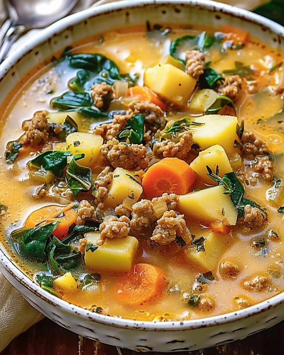 Italian Sausage Potato Soup with Carrots & Spinach is a hearty, one-pot meal full of savory sausage, tender potatoes, sweet carrots, and fresh spinach. This easy soup recipe is perfect for weeknight dinners or cozy nights in—rich, flavorful, and ready in about 40 minutes.