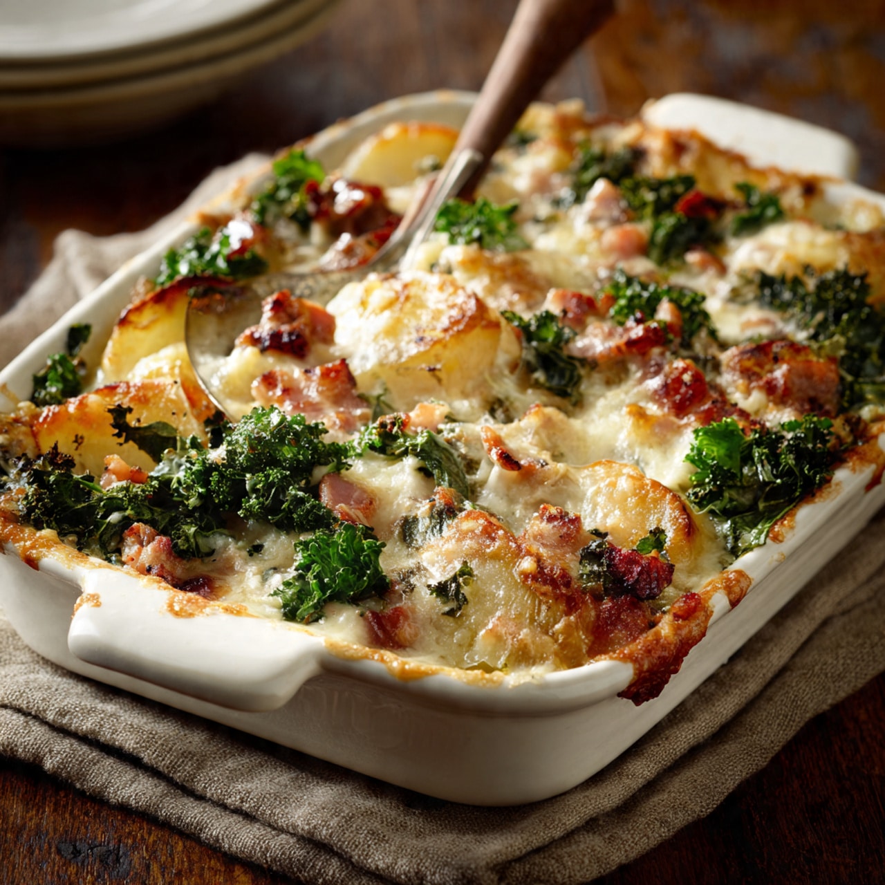 A comforting Italian Zuppa Toscana casserole featuring savory sausage, tender sliced potatoes, creamy broth, wilted kale, and melted cheese baked into a hearty, satisfying dish perfect for family dinners.