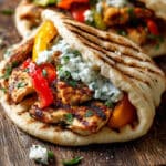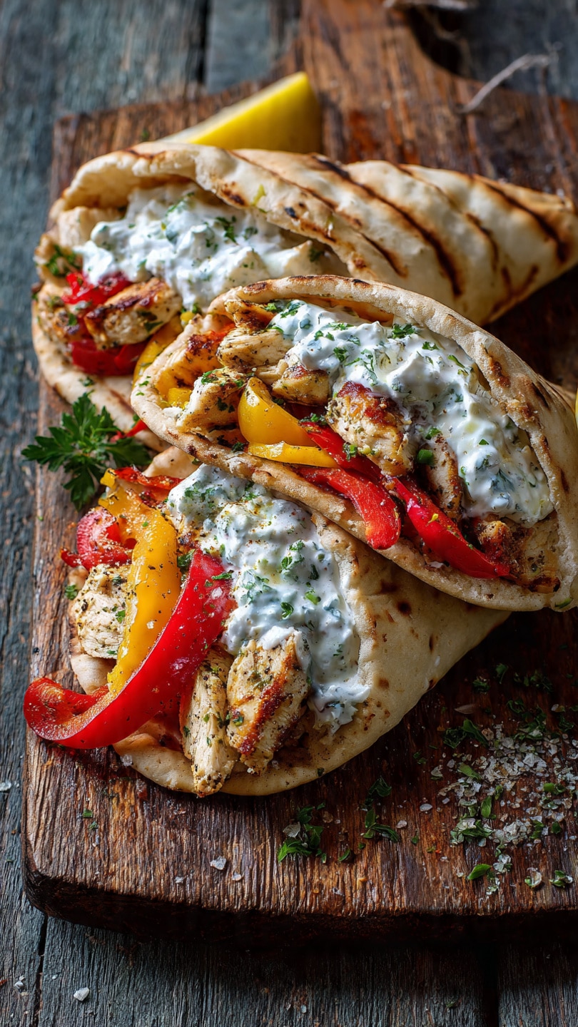 Lemon‑Garlic Chicken Pitas with Feta Tzatziki & Roasted Bell Peppers are Mediterranean‑inspired wraps featuring zesty marinated chicken, smoky roasted peppers, crisp veggies, and a creamy feta‑studded tzatziki—all tucked into warm pita bread for a fresh, bold, and satisfying meal.
