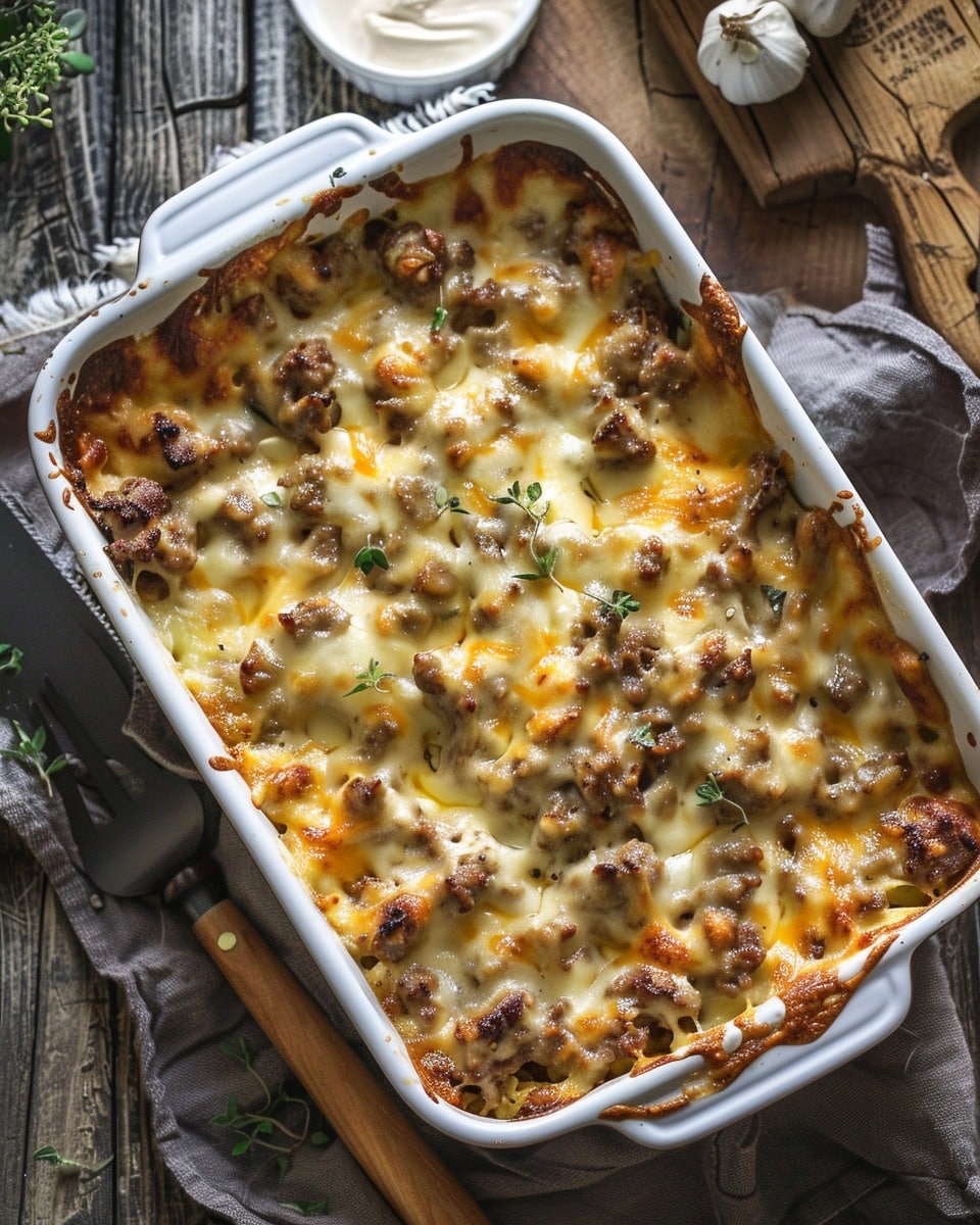 I bake the casserole for about 20–25 minutes, until the cheese is melted, bubbly, and lightly golden.