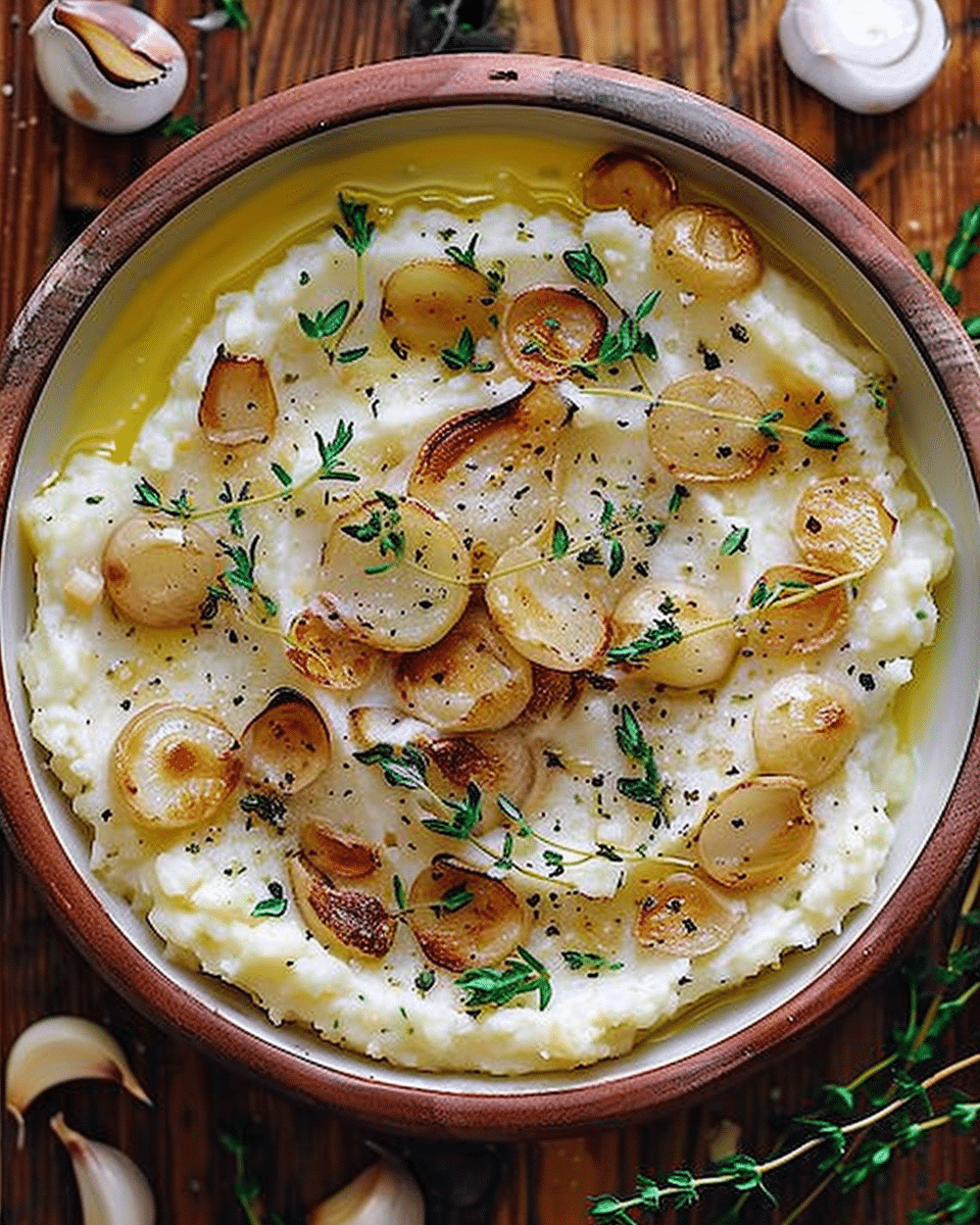 Mashed Potatoes with Parmesan, Roasted Garlic, and Fresh Thyme are rich, creamy, and full of savory flavor. This upgraded version of the classic side dish is the perfect match for any comforting meal, offering both elegance and rustic warmth.