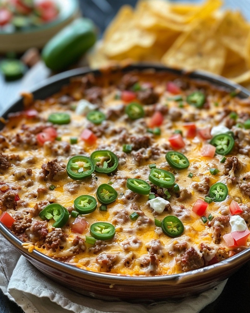 - Garnish with chopped green onions, olives, or jalapeños. Serve hot with tortilla chips.