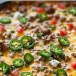 Meaty Texas Trash Dip is a warm, cheesy, and hearty party dip made with layers of seasoned ground beef, refried beans, creamy cheese, and taco-inspired flavors. Baked until hot and bubbly, it’s the ultimate comfort food for game day or any gathering.
