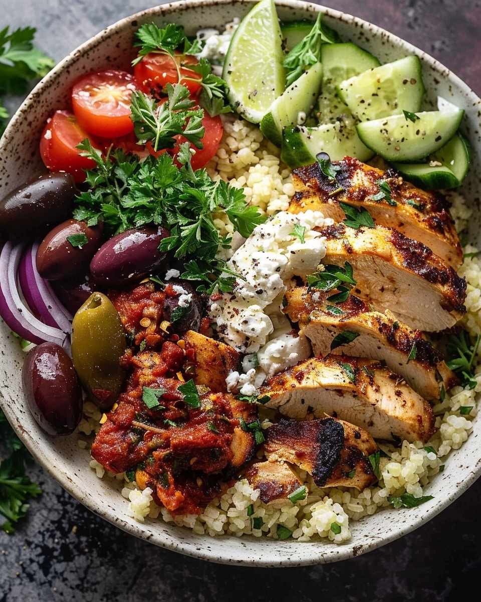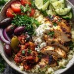 The Mediterranean chicken bowl is a vibrant, wholesome dish featuring grilled marinated chicken, crisp vegetables, fluffy grains, feta cheese, and a creamy drizzle of hummus or tzatziki. It’s a versatile, protein-packed meal that’s both fresh and satisfying—perfect for lunch, dinner, or meal prep.