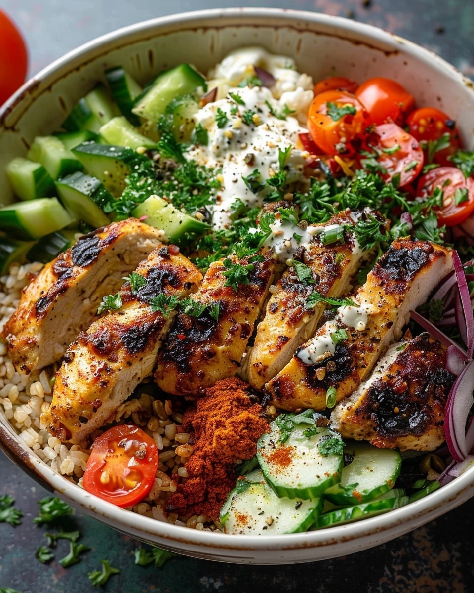 - Assemble bowls by layering grains, veggies, and sliced chicken. Top with feta, herbs, and a generous spoon of hummus or tzatziki.