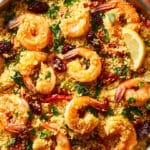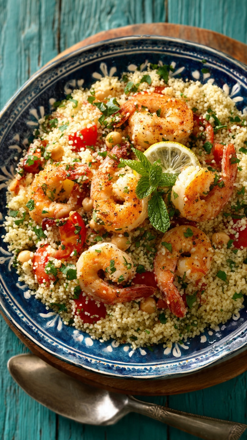 Sometimes I use pearl couscous (also called Israeli couscous) for a slightly chewier texture. If I’m not into shrimp, grilled chicken or chickpeas are great substitutes. I also love adding sun-dried tomatoes or roasted red peppers for extra Mediterranean flair. A touch of harissa or red pepper flakes can add gentle heat if I’m in the mood for a kick.