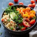This Mediterranean Quinoa Bowl is a fresh, protein-packed meal loaded with colorful vegetables, quinoa, feta cheese, and zesty lemon-garlic dressing. It’s perfect for a quick lunch, balanced dinner, or make-ahead meal prep option with bold, Mediterranean-inspired flavors.