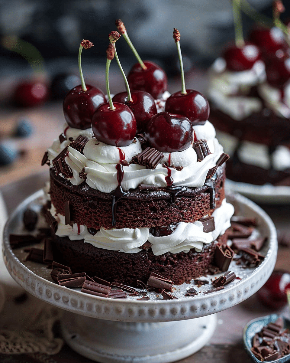 Sometimes I use kirsch to brush the cake layers for a more traditional Black Forest flavor. I’ve also swapped the cherry preserves for raspberry or mixed berries for a fruity spin. If I want an extra-rich finish, I fold a bit of melted chocolate into the whipped cream or use a chocolate ganache drizzle on top.