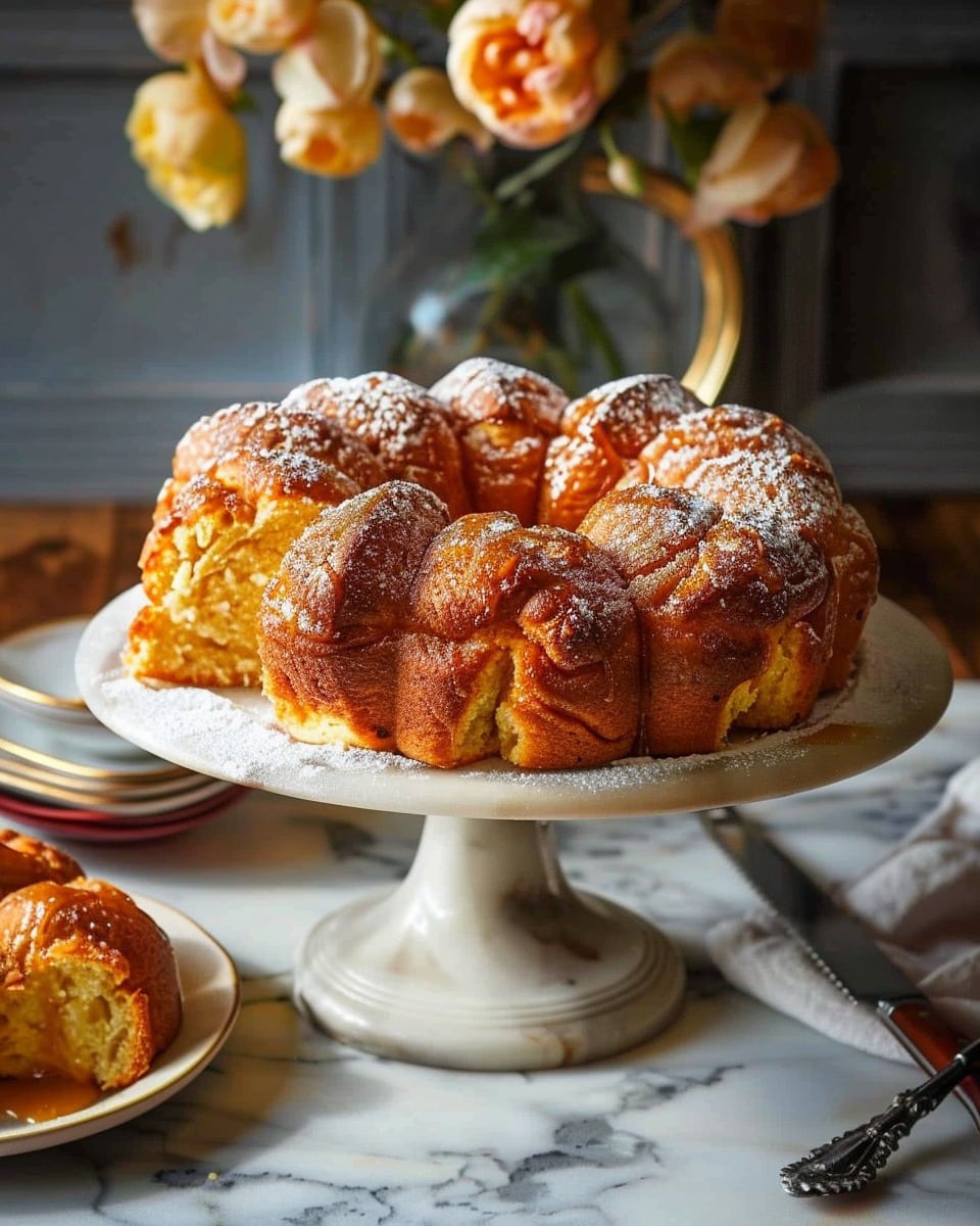 - Let the monkey bread cool for about 5 minutes, then carefully invert onto a serving plate. Serve warm.