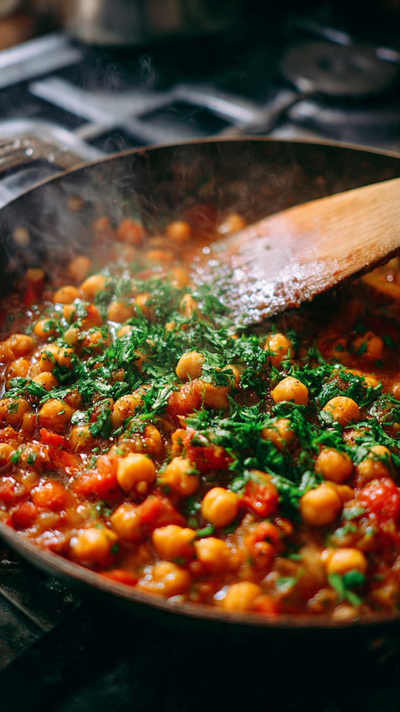 A warm and nourishing Moroccan chickpea stew filled with tender vegetables, aromatic spices, and hearty chickpeas, creating a bold and comforting plant-based meal.