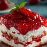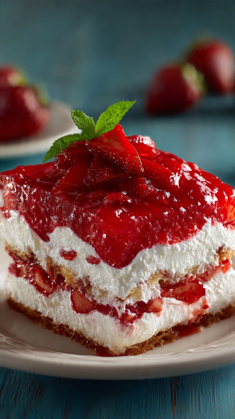 No-Bake Strawberry Jello Lasagna is a refreshing, fruity, and creamy layered dessert with a buttery cookie crust, whipped cream cheese filling, and sweet strawberry Jello with fresh berries. Perfect for warm-weather gatherings or make-ahead treats.