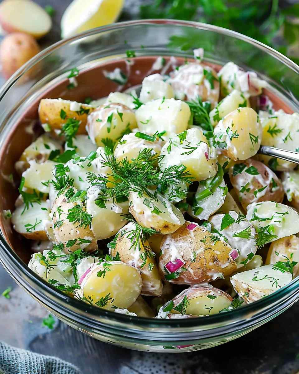 A light and refreshing potato salad tossed with fresh herbs and a simple olive oil dressing, offering a flavorful alternative to traditional mayo-based versions.