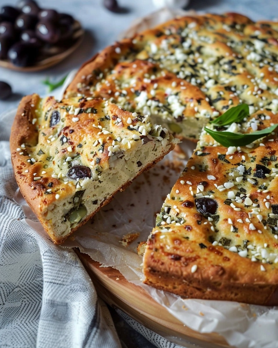 I love how effortless this savory slice is—no kneading, no rolling, no fuss. Just mix, pour, top, and bake. The feta melts slightly into the batter while the olives roast into salty bursts of flavor. It’s ideal for brunch, lunch, or as a snack with wine or coffee. I can serve it warm or at room temperature, and it always disappears fast.