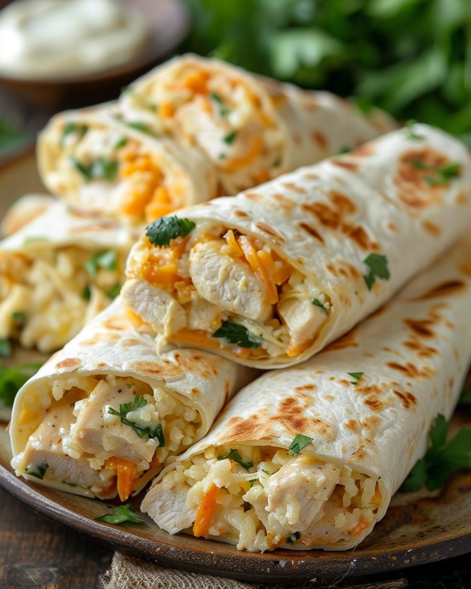 - Assemble the wraps: I spoon the cheesy garlic chicken mixture onto the center of each tortilla, then fold the sides and roll them up tightly.