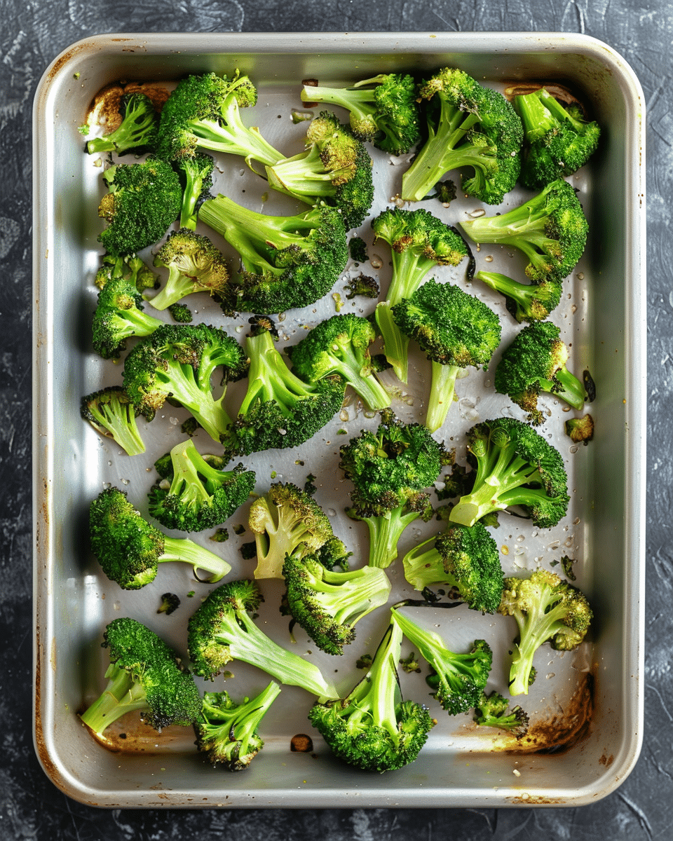 - Roast for 20–25 minutes, flipping halfway through, until broccoli is browned and crispy on the edges.