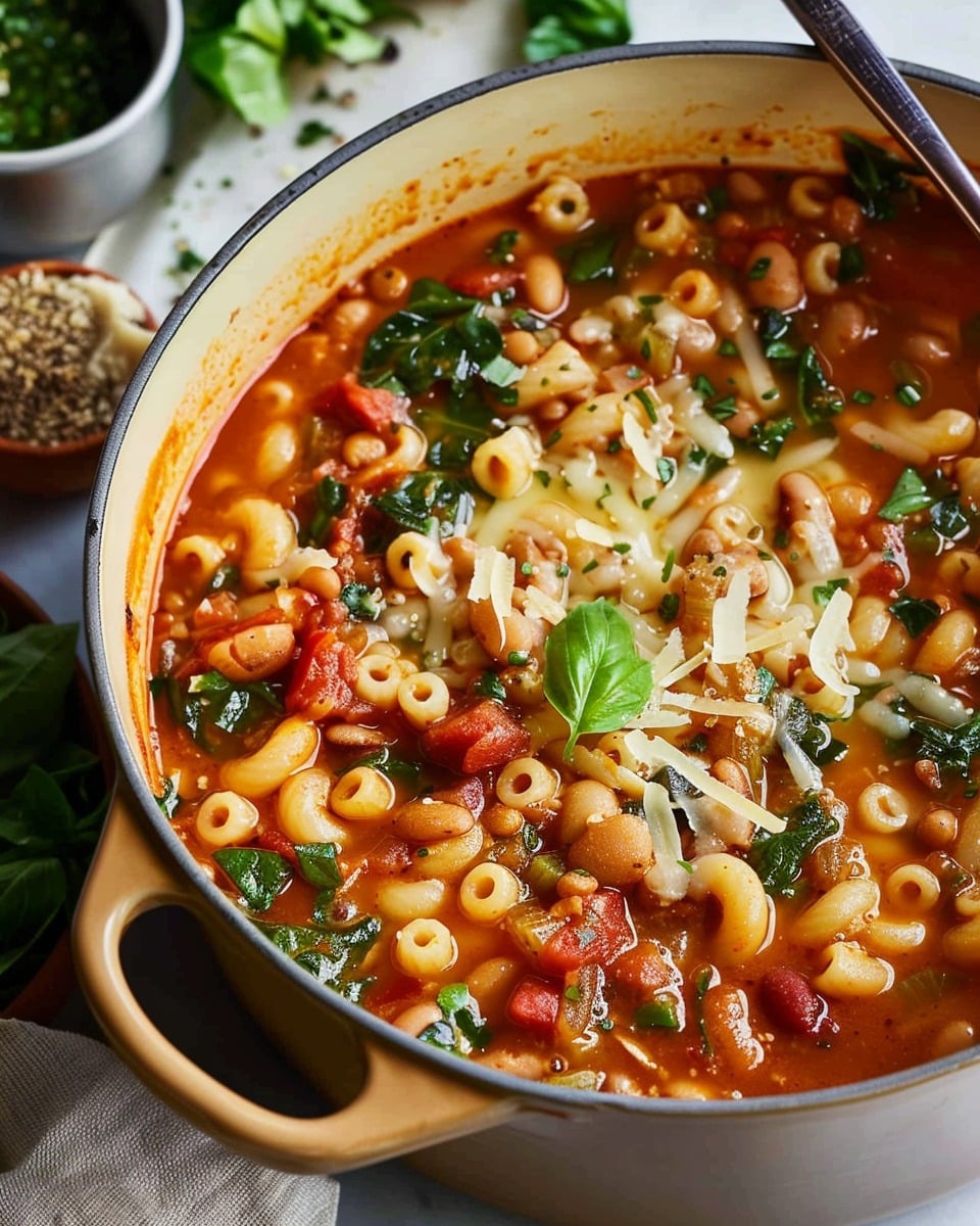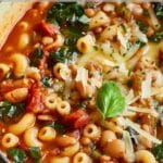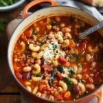 A classic, hearty pasta e fagioli soup made with tender beans, small pasta, vegetables, and herbs simmered in a flavorful broth for a comforting, rustic meal.