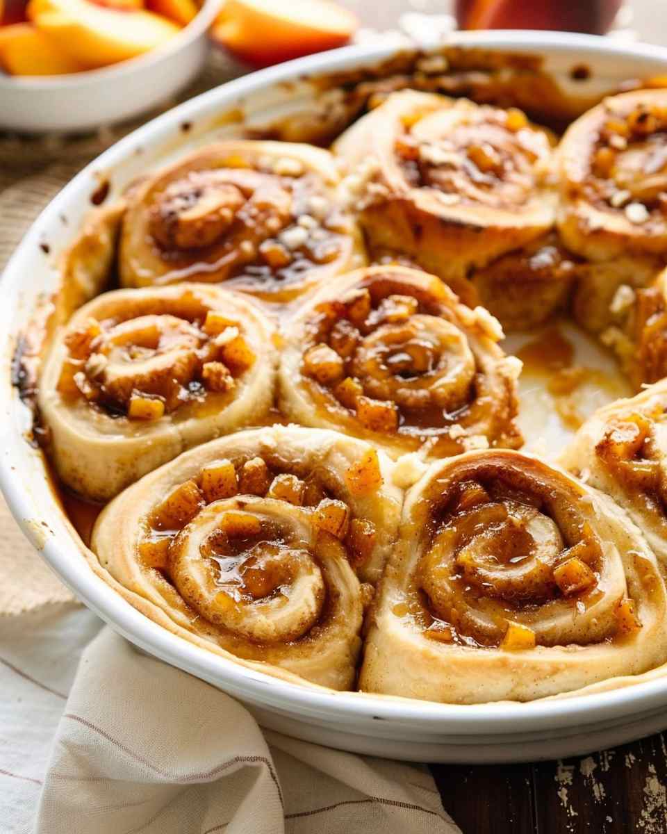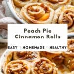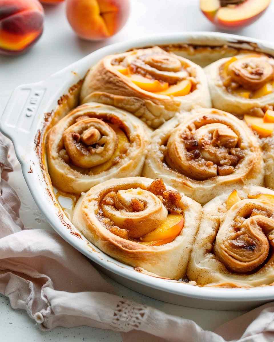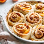 Soft and fluffy cinnamon rolls filled with a sweet peach pie filling, combining warm spices and fruity flavor into a comforting baked treat.
