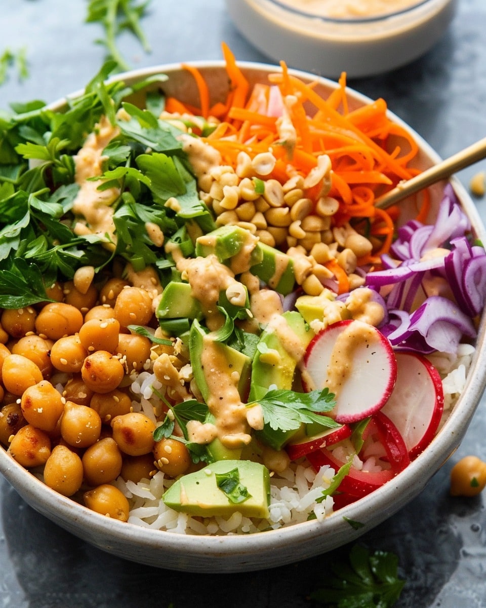 - I assemble the bowls with cooked grains, roasted chickpeas, veggies, and a generous drizzle of peanut sauce.