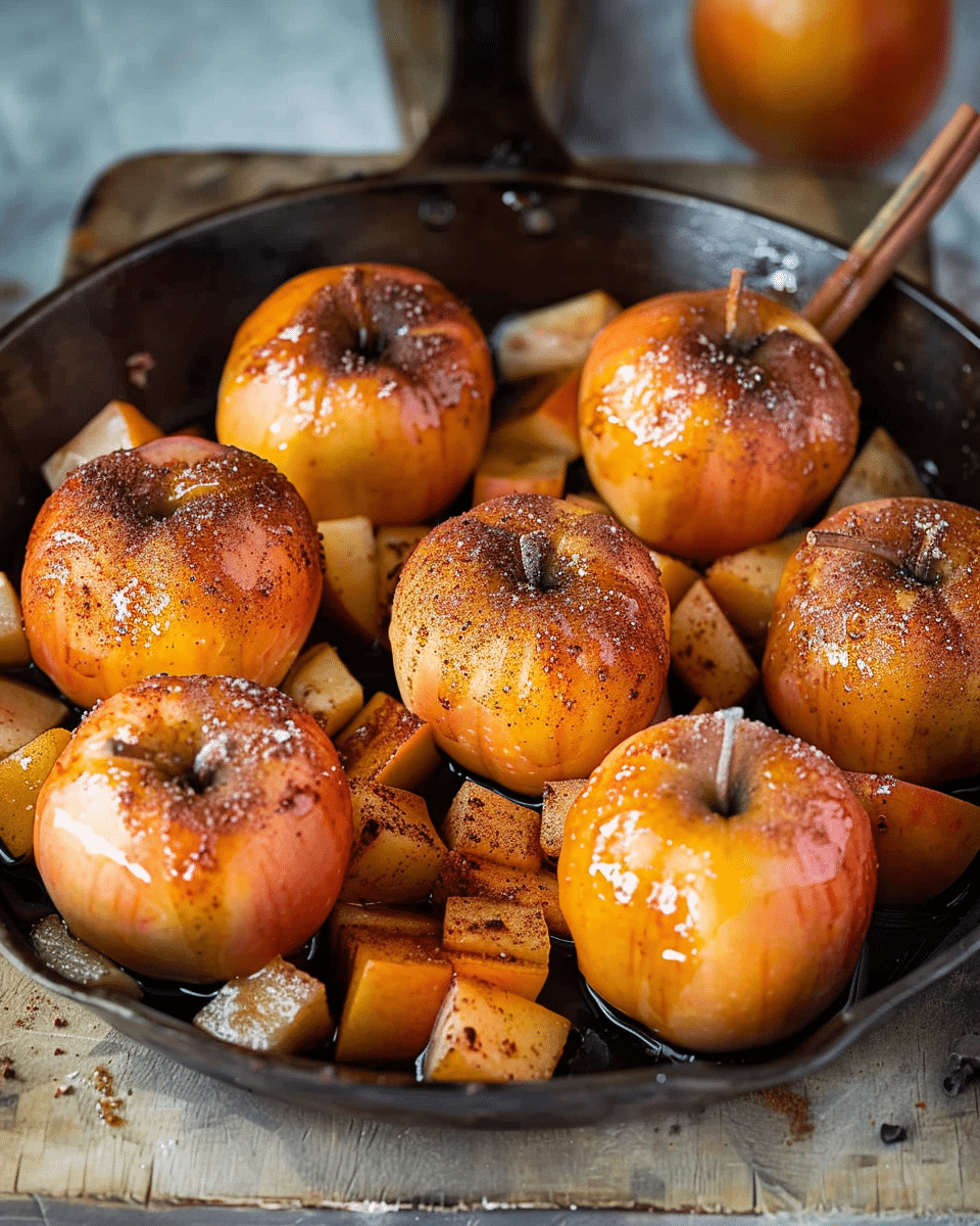 - Cook another 5–7 minutes until apples are tender and coated in a syrupy glaze.