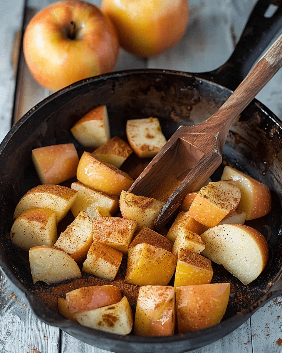 - I add the apple slices and cook for 5–7 minutes, stirring occasionally, until they start to soften.