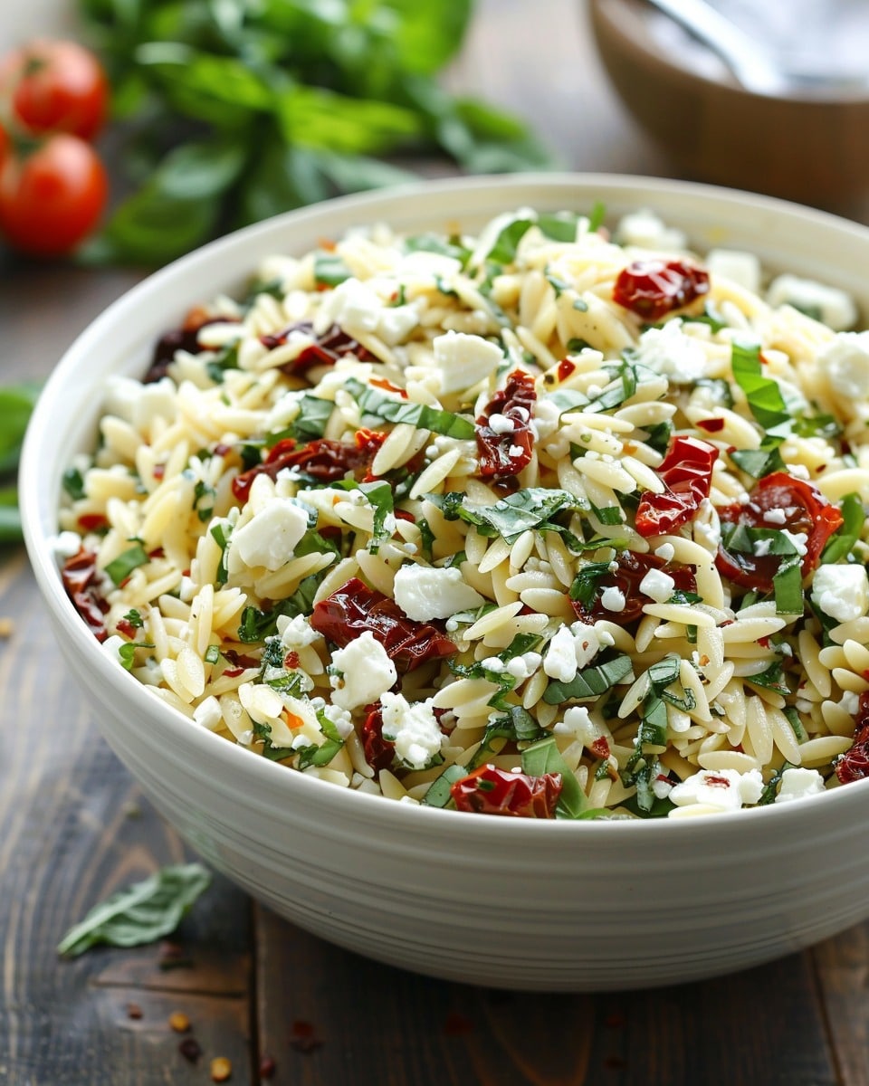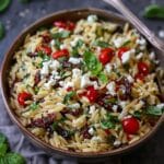 This Orzo Pasta Salad with Feta and Sun-Dried Tomatoes is a bright and flavorful Mediterranean-inspired dish made with chewy orzo, creamy feta, briny olives, and a tangy vinaigrette. Perfect for potlucks, lunches, or a light dinner.