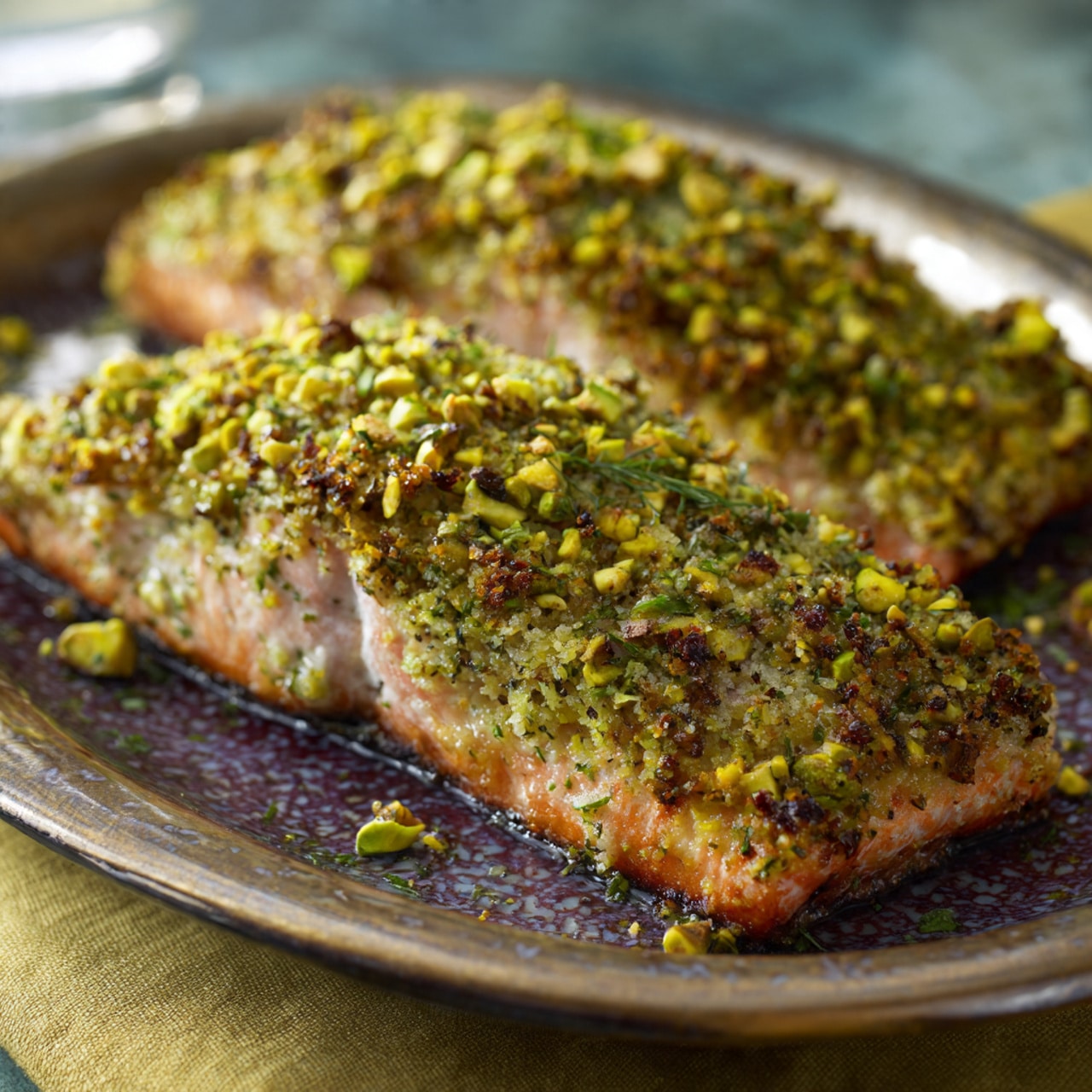 An elegant yet simple salmon dish featuring tender, flaky fillets topped with a crunchy pistachio crust, delivering a perfect balance of rich flavor and texture.