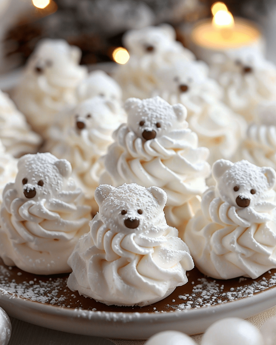 Polar Bear Meringue Kisses are light, crisp winter treats piped into adorable bear faces and decorated with marshmallows and chocolate chips. These gluten-free, low-fat sweets are perfect for the holiday season—whether for gifting, cookie exchanges, or simply a cute and festive baking project.